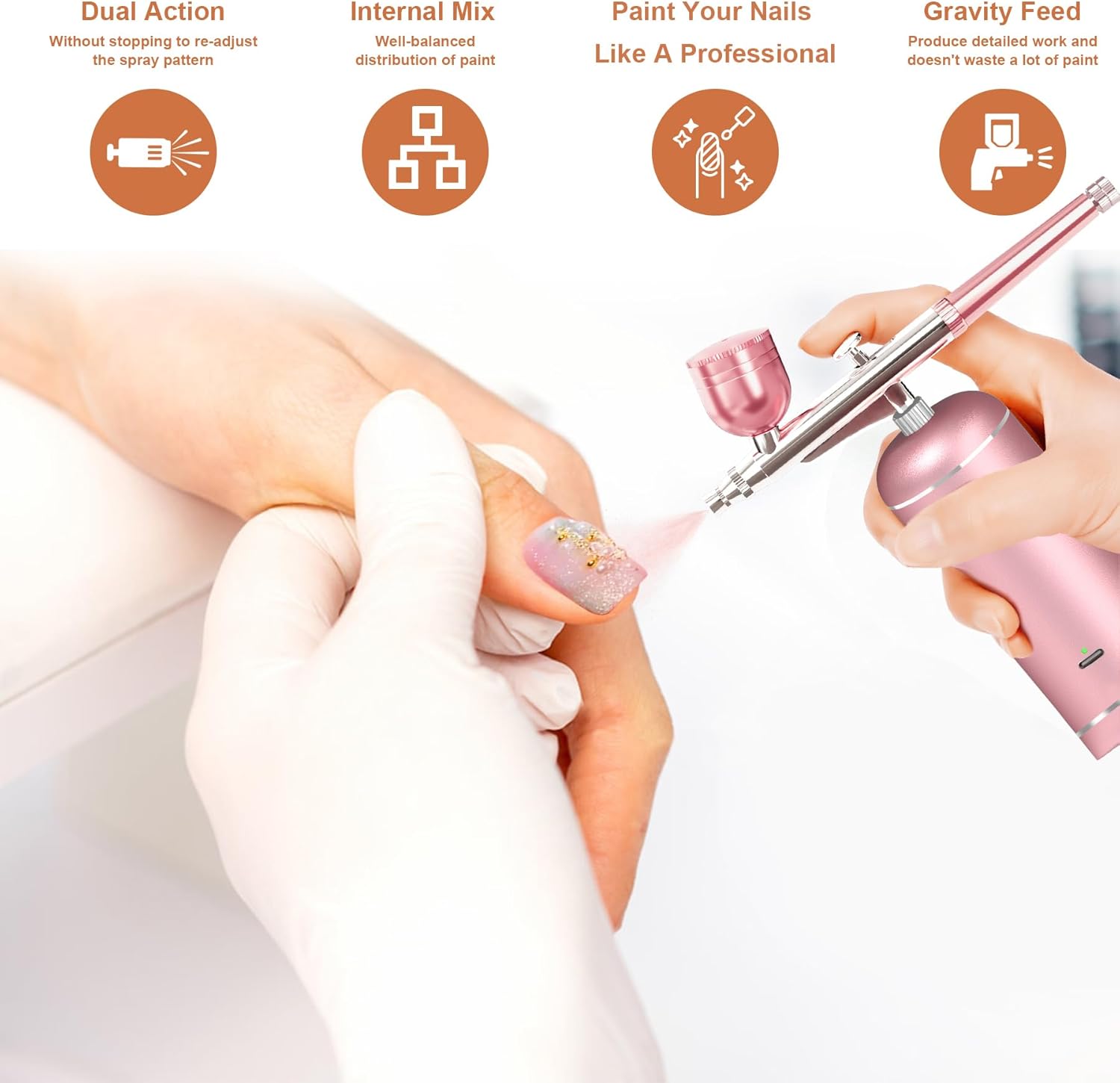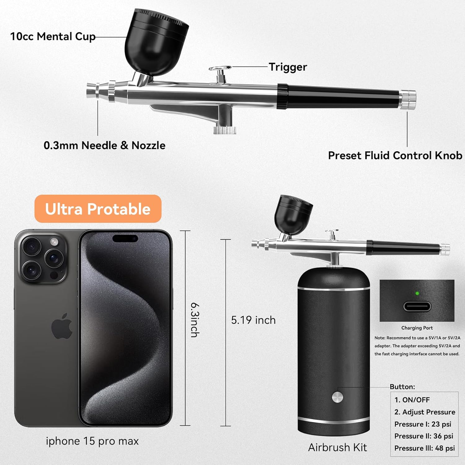 - 𝐔𝐩𝐠𝐫𝐚𝐝𝐞𝐝 𝐀𝐢𝐫𝐛𝐫𝐮𝐬𝐡 𝐊𝐢𝐭 𝐰𝐢𝐭𝐡 𝐂𝐨𝐦𝐩𝐫𝐞𝐬𝐬𝐨𝐫:Our airbrush kit features a rechargeable battery that provides over 60 minutes of continuous use. Easily charge it via USB with a power bank, laptop, or any USB charger (Type-C). The cordless airbrush body includes an indicator light to show battery power, allowing you to unleash your artistic skills wherever you are. Note: Please use a 5V/1A or 5V/2A adapter to avoid damaging the battery.